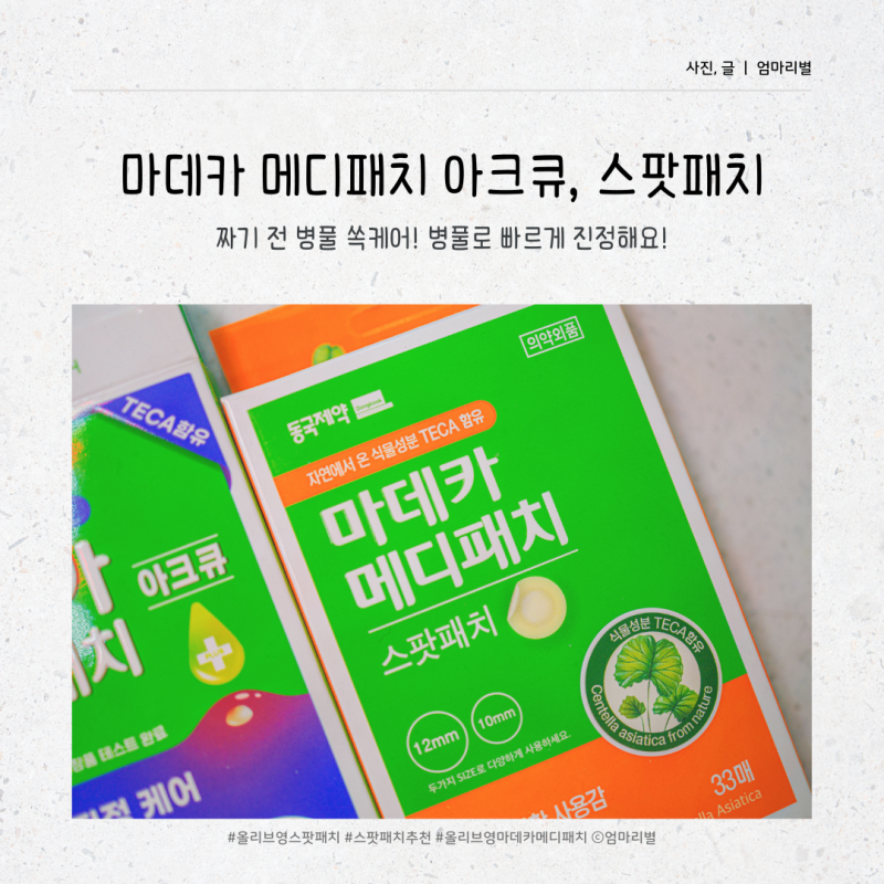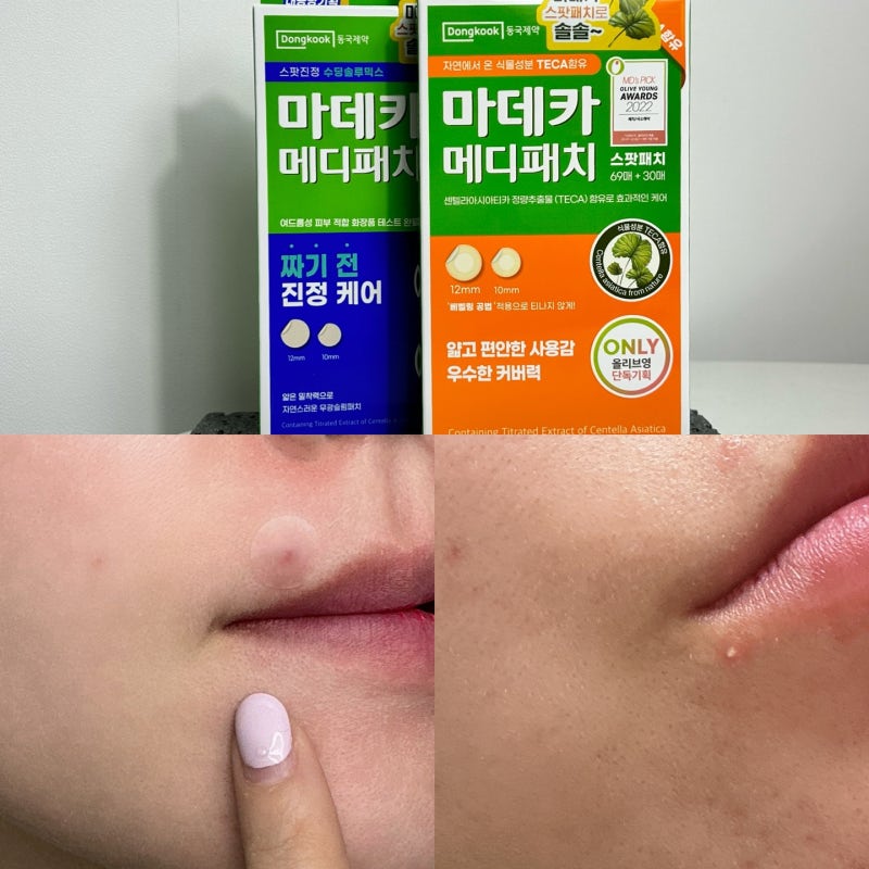 그래서 요즘은 스팟 패치가 나에게 꼭 필요한 아이템이 됐다. 특히, 짜내기 전 피부를 빠르게 진정시켜주는 동국제약의 마데카 제품은 매우 유용하다.
