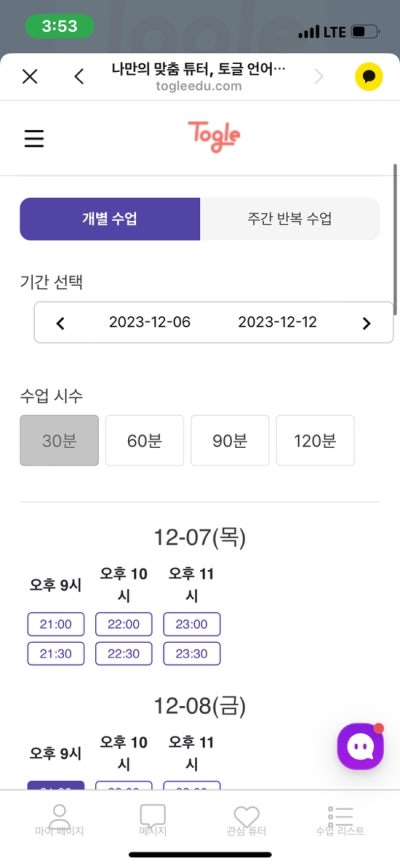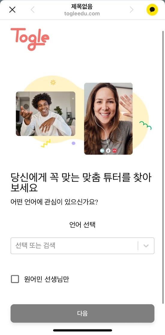 Toggle을 사용하면 컴퓨터나 휴대폰에서 위에 나열된 사이트로 이동하여 수업에 등록할 수 있습니다. 원어민 선생님만 선택하는 옵션도 있습니다.