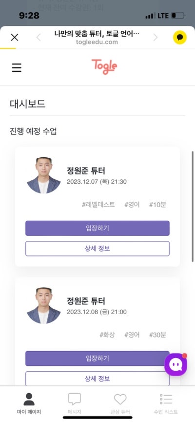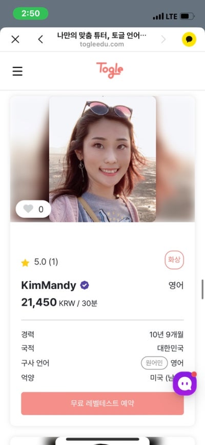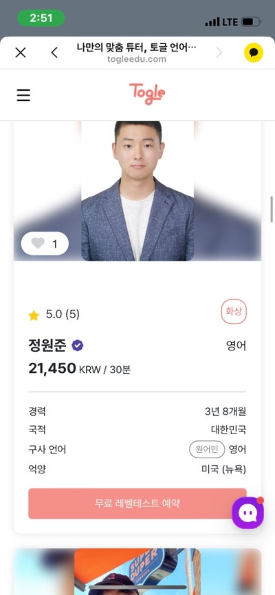 함께 수업을 듣고 싶은 강사 몇 명을 선택했습니다. 영어회화 사이트 토글(Toggle)에서는 경험, 국적, 사용언어, 억양, 수강생 리뷰까지 한 번에 볼 수 있어, 자신에게 잘 맞는 튜터나 배우고 싶은 분야의 튜터를 매칭받을 수 있습니다. 나는 그것이 장점이라고 생각한다. 특히 저는 경험이 많고 억양이 친숙한 튜터를 선택했습니다. 사실, 익숙한 사투리보다는 익숙하지 않은 사투리로 공부하면 실력이 더 향상될 것입니다. 지난번 미국 여행을 갔을 ​​때 라틴 영어 발음을 듣고 헷갈렸어요. 토글의 튜터를 어떻게 선발하고 관리하는지 시스템에 대해서는 잘 모르지만 언어에는 자신있습니다! 하시는 분들은 튜터로 일하시면 좋을 것 같아요. 이렇게 튜터와 튜티가 수업을 계획하고 어디서든 전화나 구글미팅으로 수업을 진행해서 시간도 벌고 돈도 벌고.. ㅎㅎ. 좋은 일인 것 같았습니다. 그건 제쳐두고 .. 큰 일이었습니다. 아무튼 저는 ‘개인수업’으로 딱 한 번만 수업을 예약했어요. 한번 해보고 괜찮으면 계속 해볼 생각이에요. 매주 같은 요일, 같은 시간에 계속해서 수업을 수강할 수 있는 ‘주간 반복 수업’도 있습니다. 토글은 좋은 옵션입니다. 좋은 점은 처음 수업을 듣는 멘토님과 함께 레벨테스트로 10분 수업을 무료로 들을 수 있는 기회가 주어진다는 점입니다. 레벨을 선택할 수 있는데 토글에는 레벨이 1~5까지 있어서 지난번에 영어 영상을 찍을 때 참 아쉬웠어요. 그래서 저는 혼자서 초급 2단계를 선택했습니다. 수업 예약을 하시면 카카오톡으로 수업 참여 링크를 보내드립니다. 오늘 수업이 있으면 오전에 카카오톡으로 알려드려요. 레벨테스트를 보신 후 후기를 말씀드리자면, 튜터님들은 영어는 물론이고 영어도 잘 하십니다. 그리고 한국어를 잘하는 분들이 많아서 제가 부족한 부분에 대해 헷갈리지 않고 바로 피드백을 줄 수 있는 장점이 있어요. 지저분한 문장을 한국어 문법에서 영어로 옮기면, 한국어를 모르는 튜터도 전혀 이해할 수 없는 문장도 쉽게 이해할 수 있습니다. ㅋㅋㅋㅋㅋ 물론 한국어도 잘하는 튜터를 골랐는데, 완전 원어민 현지 튜터한테 수업을 들으면 어려움을 이겨내고 더 성장할 수 있겠죠…? 내가 수강한 튜터님과 함께한 수업 리뷰! 먼저 실수를 고백하겠습니다 ㅠㅠ… 레벨테스트는 오류 없이 진행되었는데 수업 시간을 착각해서 예상치 못한 시간에 구글미팅에 가서 나오지 않았는데 다시 확인해 보니 깨달았습니다. 시간을 완전히 착각했네요.. 아쉽네요… 착오없으시길 바랍니다… 그래도 25분 동안 레벨테스트를 아주 만족스럽게 잘 봤습니다!!! 진심을 담아 리뷰를 남깁니다. 1. 우선 영상영어수업은 구글미팅을 통해 진행되었습니다. 컴퓨터나 노트북을 사용하시는 경우 사전에 구글 계정으로 로그인이 필요합니다. 휴대폰이나 태블릿을 사용하시는 경우에는 들어갈 때 앱을 다운로드하라는 안내가 나옵니다. 미리 다운받아서 구글 계정으로 로그인해 놓으면 편리할 것 같습니다. 2. 튜터님이 한국어를 잘 아시기 때문에 (자세한 튜터 정보는 위 사진을 참고해주세요) 먼저 레벨테스트 설명을 영어로 할 것인지, 아니면 한국어로 할 것인지 물어보셨습니다. 보시다시피 저는 가능하면 영어를 배우려고 계속 노력하고 있었기 때문에 모든 것을 영어로 해달라고 부탁했습니다. 하지만 의사소통이 안되면 한국어로 한마디 하더군요. ㅋ. 3. 레벨테스트에서는 자기소개를 하고, 영어를 공부하는 이유와 일상생활을 영어로 이야기했습니다. 튜터님 말씀대로 제가 2급이라고 미리 써놨는데, 영어로 생각을 표현하는 부분이 4급이 되신다니 좀 뿌듯하네요..^^ 와. 4. 수강신청 이유를 듣고 진행 방법을 결정하겠습니다. 자격증 취득/일상 영어회화, 독서와 회화/주제 정하고 토론 등 학습 목적에 맞춰 진행됩니다. 펜팔처럼 편안한 분위기에서 영어회화 수업을 진행하실 수 있습니다. 있어서 너무 좋았어요! 레벨테스트도 원래는 10분인데 튜터님이 25분으로 해주셨네요… 최고.. 감사합니다. 다음번에 Toggle 수업에 재등록하게 된다면 원준선생님과 꼭 수업을 듣고 싶습니다. 영어뿐만 아니라 다양한 나라의 언어로 회화 수업이 필요한 분들을 위해. 한국어와 영어를 잘해서 내가 말도 안 되는 말을 해도 완벽하게 고쳐준다. 가격대와 수업구조, 튜터(특히 성인대화)를 선택할 수 있는 자유도가 높은 수업을 원하시는 튜터가 필요하신 분들께 추천드립니다!