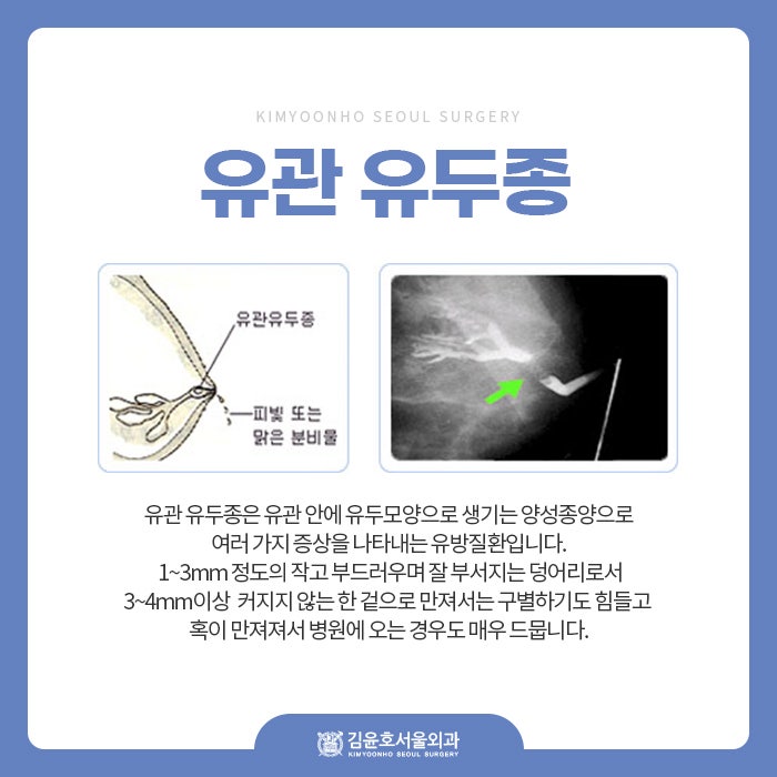 안녕하세요, 연세유방영상의학과 입니다. 오늘은 비교적 흔한 유방질환인 관내유두종에 대해 알아보겠습니다. 유두종은 유방의 유선 내에서 우유가 흐르는 통로에서 발생하는 유두종입니다. 이 병변은 대개 크기가 작고 만져지는 덩어리로 발견되지 않으나, 유관 내부에서 발생하기 때문에 유두 분비물이 발생하는 병변입니다. 유두 분비물의 색깔이 갈색이거나 핏빛 붉은색일 수 있으므로 유방암과 감별이 필요한 병변입니다. 따라서 혈성 유두 분비물 증상이 나타나면 유방 검진을 하여 이를 유발하는 병변을 찾아 조직검사를 시행해야 합니다.