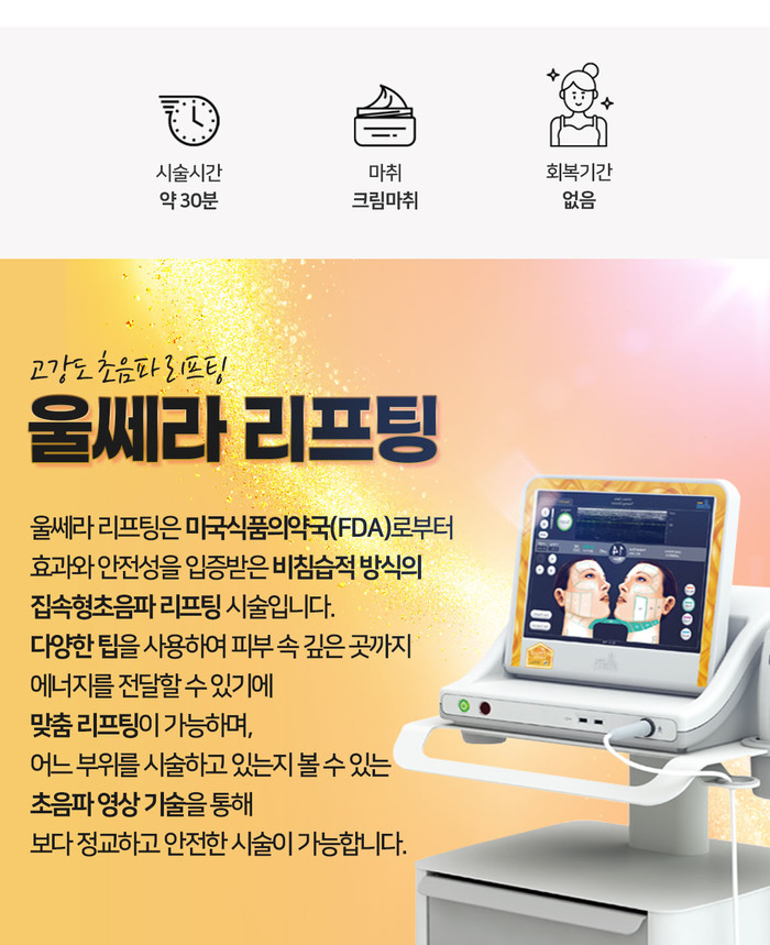 먼저 자신의 피부 두께, 얼굴형, 지방 분포 등을 잘 숙지해야 합니다. 울쎄라 원리는 강력한 초음파를 이용해 피부 아래 인대 조직을 수축시켜 리프팅 효과를 만들어내는 원리입니다. 오징어를 구울 때 불로 인해 오징어가 오그라들게 됩니다. 여러분 모두 리프팅이 어떤 모습인지 아실 겁니다. 피부의 늘어진 부분을 수축시켜 리프팅 효과를 줍니다. 피부인대 사이에는 지방이 존재하는데 이때 지방이 녹아내릴 수 있으니 주의하셔야 합니다.