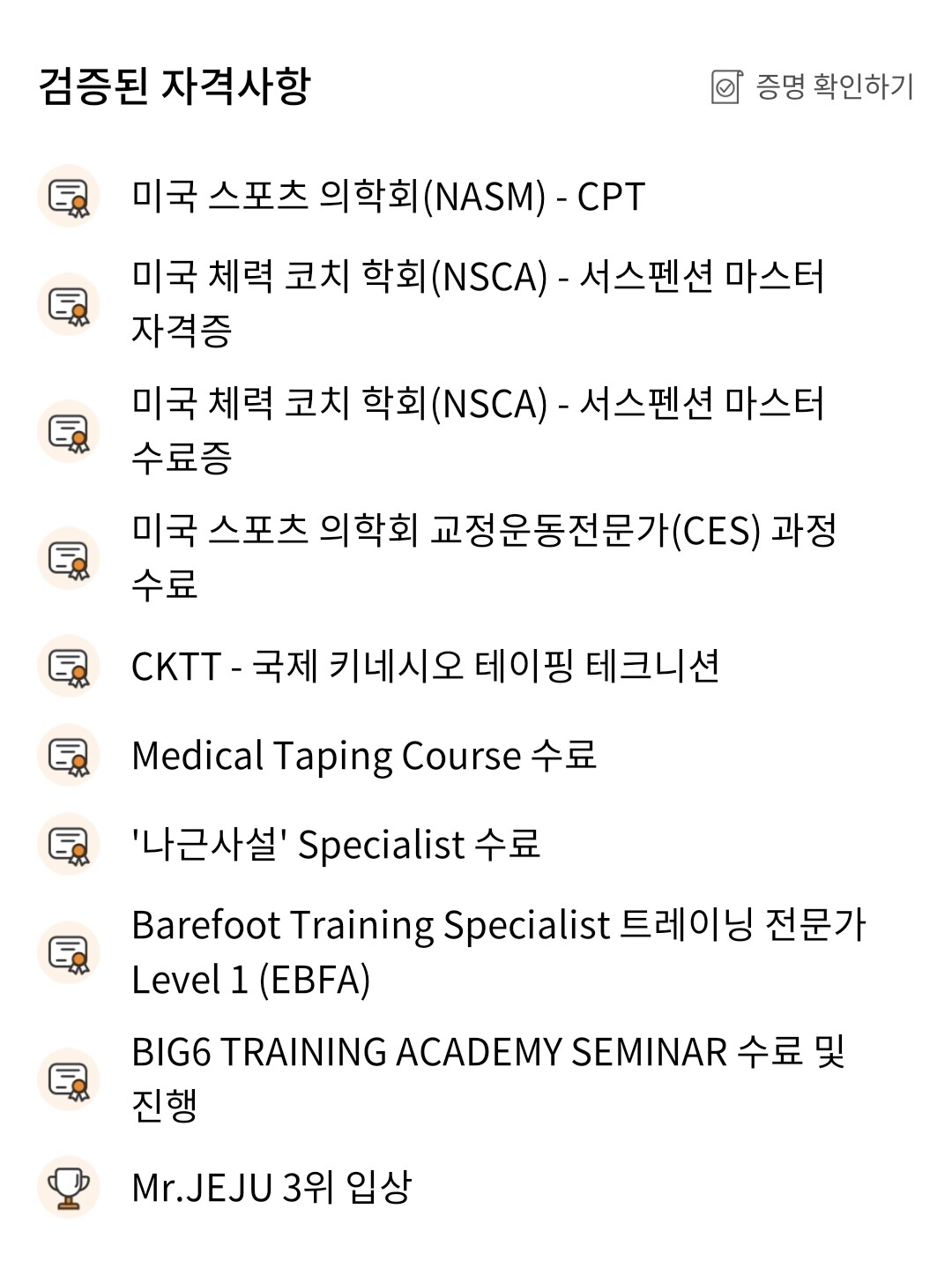 15년 경력의 트레이너 트레이너 국제 자격과정 트레이닝 강사 다수의 전문 운동선수 및 트레이너 담당 스포츠 브랜드 언더아머, 스파이더 트레이너 가천의과대학교 운동재활복지학과 파트너 기관 NASM 미국스포츠의학회 공인인증센터