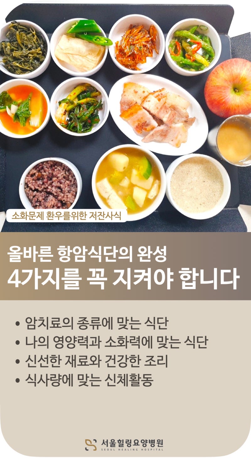 항암 단계는 예상보다 길어지기 때문에 그 기간 동안 환자의 체력이 급격히 쇠퇴하기 쉽습니다. 따라서 미네랄, 비타민, 단백질, 지방, 탄수화물 등 균형 잡힌 영양 섭취를 통해 면역력을 강화하고, 먹는 즐거움이 사라지지 않도록 하는 것이 중요하다.