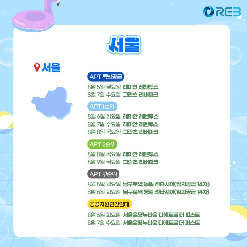 레비와 함께 구독 일정을 미리 알아보자. 벌써 8월이 시작됐어!! 건강 조심하고 시원한 여름 보내세요. 8월 둘째 주에 예정된 서울/인천/경기/대전/전북 구독 소식 함께 알아보자?!